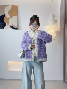 爱元大码女装针织衫2025秋季新款胖妹妹拼色V领针织开衫秋装F589