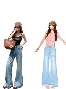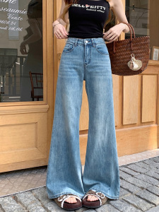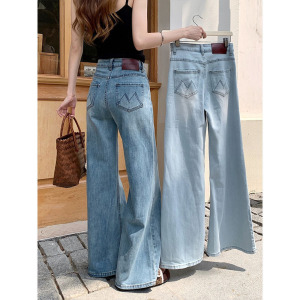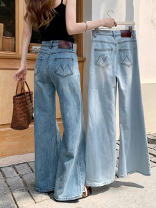 浅色不贴腿阔腿微喇刺绣高腰显瘦弹力牛仔裤女秋季薄款宽松拖地裤