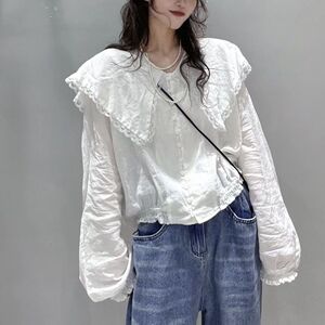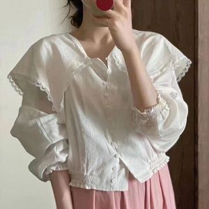 韩系软糯蕾丝花边拼接娃娃领长袖防晒衬衣女春秋季新款排扣上衣