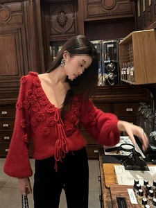 温柔立体花朵圣诞穿搭红色毛衣女早春新款宽松显瘦慵懒针织上衣