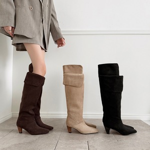 绒面翻边两穿骑士靴女过膝长靴秋冬新款方头粗中跟套筒瘦瘦靴女靴