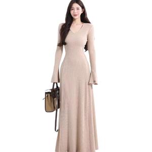 茶香可颂时尚收腰修身秋冬气质针织配大衣的长袖连衣裙女A字长裙
