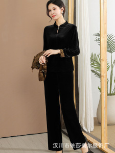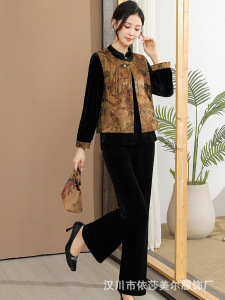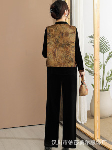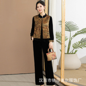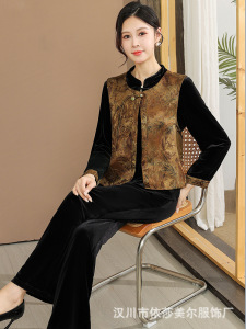 新中式复古马甲打底衫套装2025时尚秋冬新款中年妈妈国风丝绒套裤