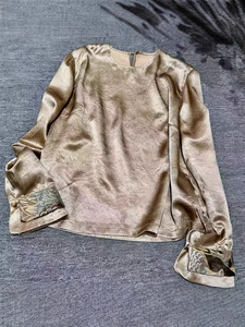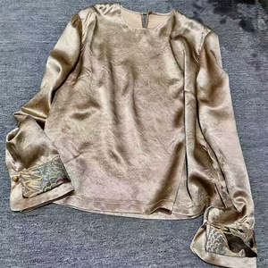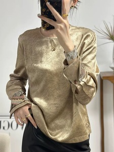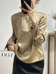 2025秋季新款醋酸面料圆领盘扣复古贵气优雅金色百搭内搭长袖上衣