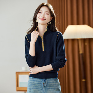 2025春秋冬新款polo领宽松慵懒风针织衫拼色打底上衣半拉链毛衣女