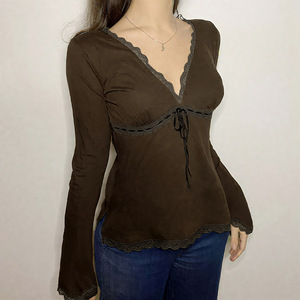 ins欧美风复古棕色蕾丝拼接撞色V领长袖秋冬显瘦收腰内搭A摆上衣