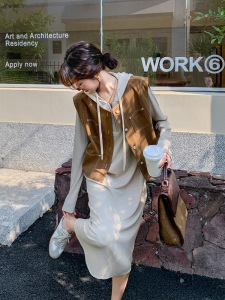 工装马甲连帽卫衣连衣裙套装女秋小个子韩系减龄穿搭长裙两件套