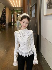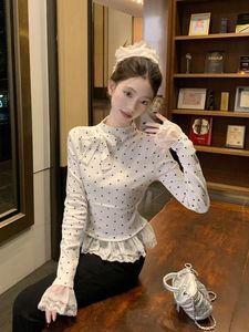 白色波点半高领长袖T恤女秋季蝴蝶结打底衫蕾丝花边内搭短款上衣