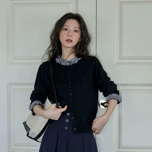 25秋冬新款女丝绒+羊毛布艺花边开衫针织衫外套长袖显瘦气质洋气