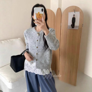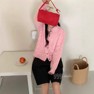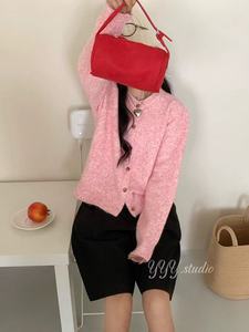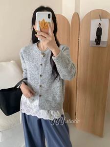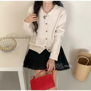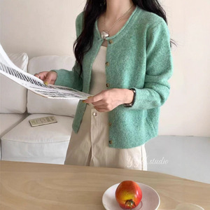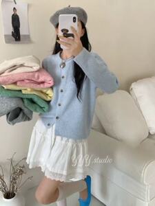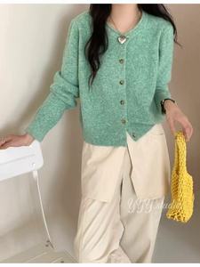 韩系早秋新款卷边圆领单排扣长袖针织开衫软糯减龄针织外套女