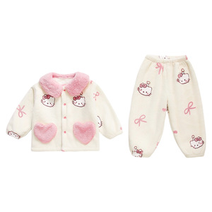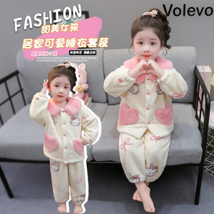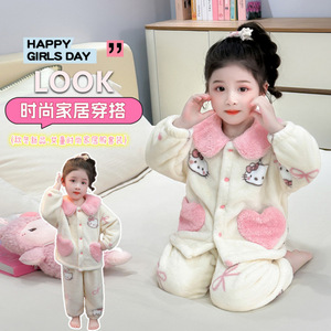 儿童睡衣女孩秋冬季珊瑚绒女宝爱心猫咪翻领法兰绒套装女童家居服