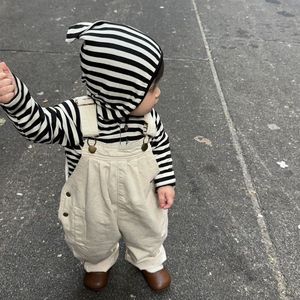 条纹帽衫+背带裤