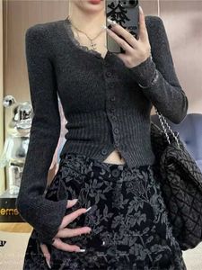 灰色V领蕾丝内搭打底衫女秋季2025新款针织衫短款上衣设计感小众