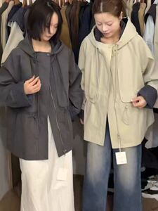 高端25秋新款欧洲站连帽抽绳收腰格子拼接外套女宽松百搭夹克上衣