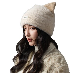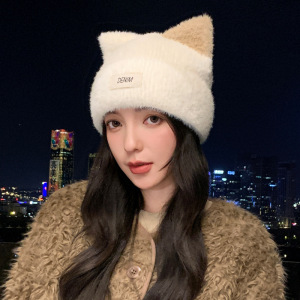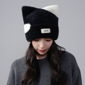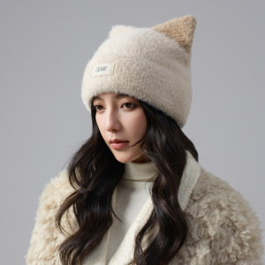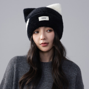 冬天帽子女可爱甜酷风猫耳朵针织帽防风保暖护耳包头帽拼色百搭帽