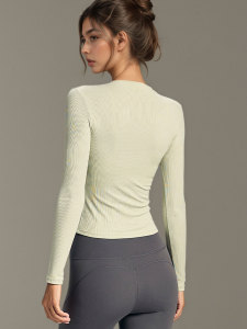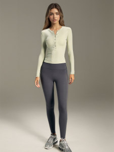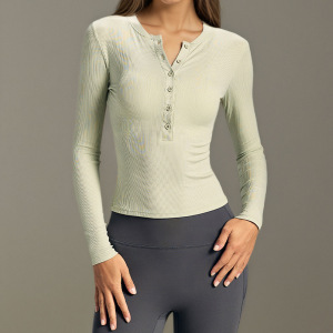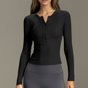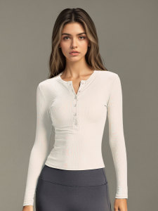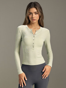 跨境新款亨利衫上衣女正肩瑜伽服T恤收腰修身长袖内搭运动打底衫