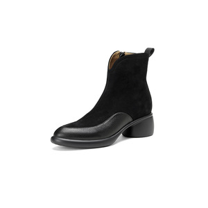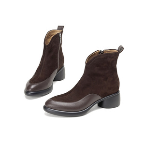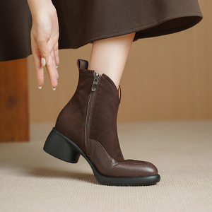 翻毛皮短靴女春秋单靴2025新款尖头中跟高跟靴粗跟真皮磨砂冬加绒