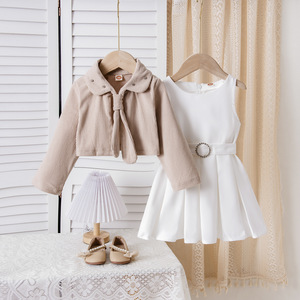外贸跨境冬装女童套装 纯色坑条加厚外套配背带连衣裙两件套