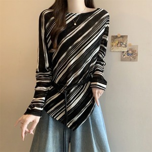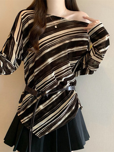 2025秋季新款女装轻熟风T恤显瘦气质收腰系带条纹长袖上衣女A7450