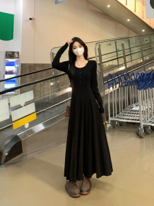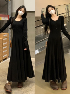大码微胖mm2025年秋季新款长袖黑色连衣裙女装打底内搭a字长裙子