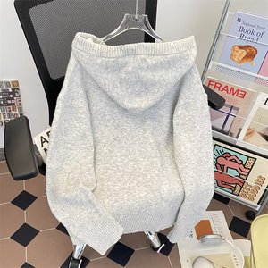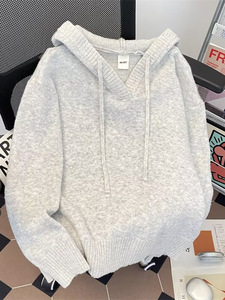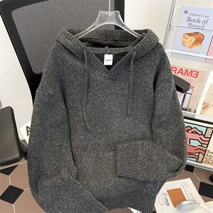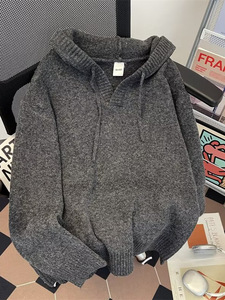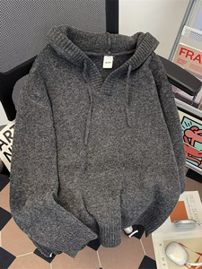 灰色连帽毛衣男秋冬季新款痞帅慵懒风宽松休闲套头针织连帽衫外套