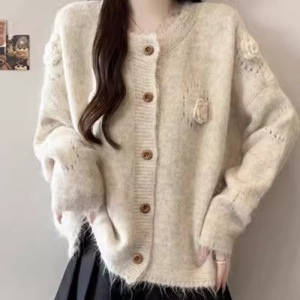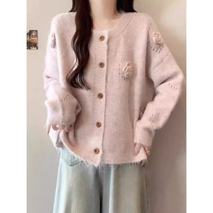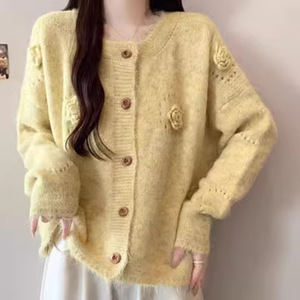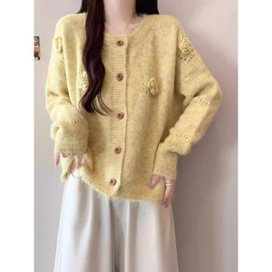 韩系慵懒风立体花朵单排扣针织开衫秋冬新款软糯时尚洋气百搭外套