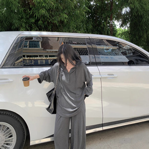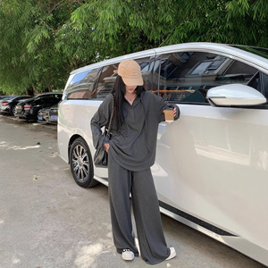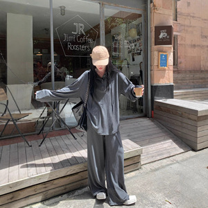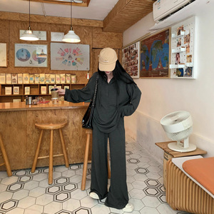 大码早秋季松弛感休闲气质连帽长袖T恤+高腰阔腿裤两件套