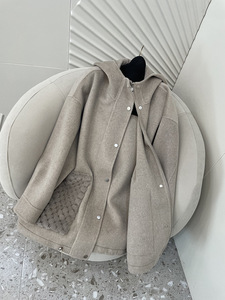 跨境LP同款老钱风燕麦色连帽中长款双面羊绒大衣口袋菱形水貂外套