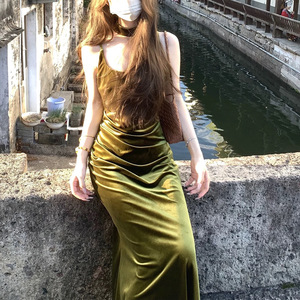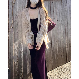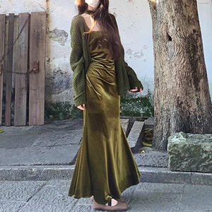 森系曳地 秋季新款2025丝绒鱼尾裙女气质连衣裙a字长裙子开衫套装