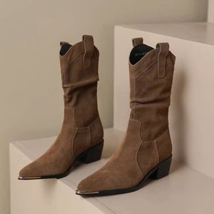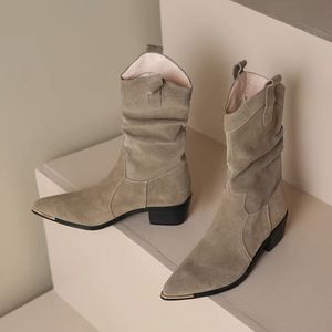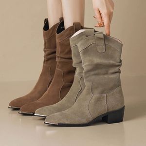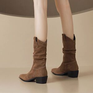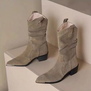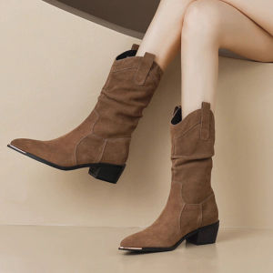 欧美风西部牛仔靴2025秋冬新款尖头磨砂皮短靴女小个子粗跟堆堆靴