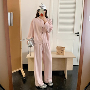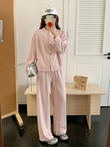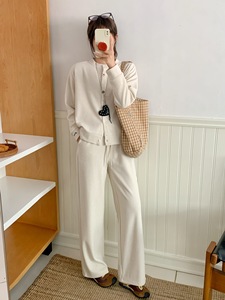 小个子套装休闲秋季时尚羊绒针织开衫刺绣休闲圆领两件套阔腿裤