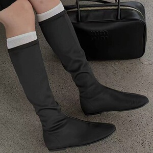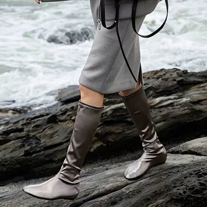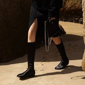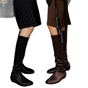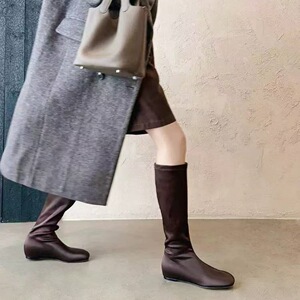2025秋冬新款坡跟高筒中筒宽松套筒真丝布面不过膝长靴骑士靴女