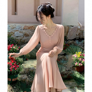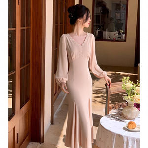 2025秋季新款小众法式鱼尾复古高腰修身显瘦灯笼袖V领温柔连衣裙