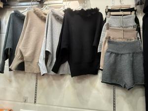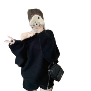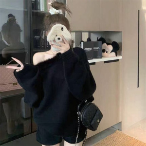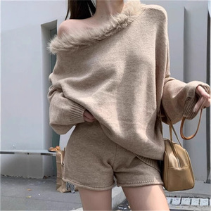领斜肩一字肩毛衣女2025秋冬新款宽松慵懒风针织衫短裤显瘦两件套