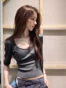 韩系休闲风灰色u领中袖t恤女秋季薄款设计感小众辣妹修身显瘦上衣