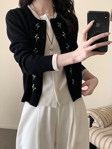 25秋冬款韩系简约时尚百搭圆领小花朵手工刺绣全羊毛针织开衫毛衣