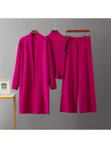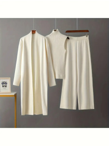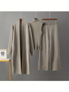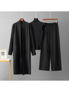 工厂定制秋冬慵懒宽松针织衫套装女长款开衫高领毛衣阔腿裤三件套
