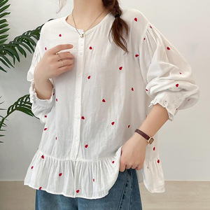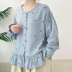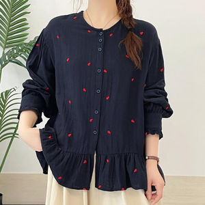 爱心棉纱长袖衬衫日系森女系文艺圆领单排扣减龄百搭宽松上衣