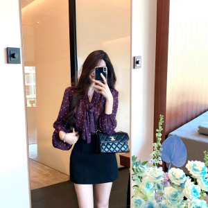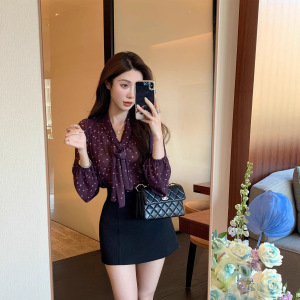 JustQin紫雾星澜2025新款秋装飘带雪纺衫上衣波点长袖衬衫女