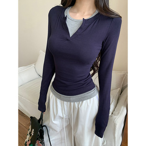 Moses Queen/魔西女王黑白撞色假两件打底V领长袖T恤修身百搭上衣