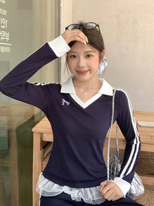 polo翻领条纹撞色长袖T恤女装早秋穿搭条纹杠内搭打底衫修身上衣