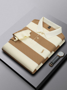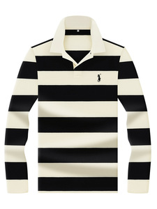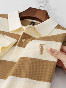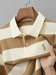 秋季新款男翻领撞色条纹刺绣小马标上衣男商务休闲菠萝纹面料青年