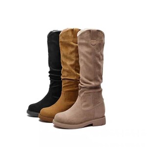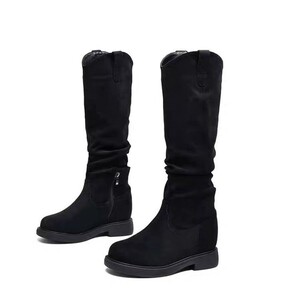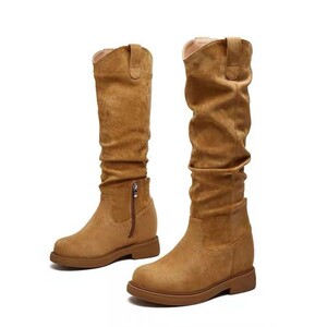 2025年秋季新款褶皱高筒靴复古木纹粗跟圆头堆堆靴女长靴弹力靴