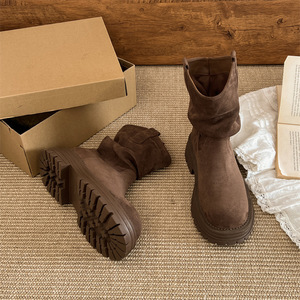 牛皮版复古百搭休闲绒面中筒靴秋冬新款英伦厚底增高透气堆堆靴女