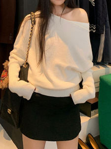 云映 慵懒风一字领露肩山羊绒套头毛衣女设计感韩系宽松斜肩针织