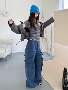 MMFISH时髦街头灯芯绒复古拼接双口袋直筒阔腿显瘦工装裤25K539