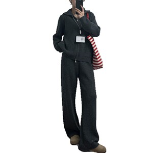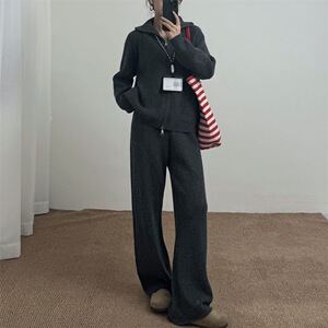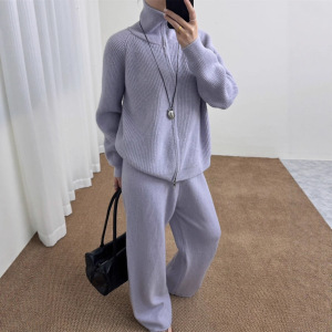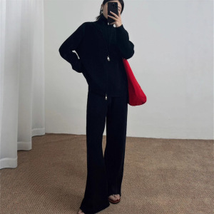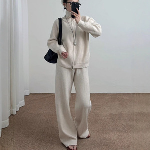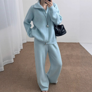 2025秋冬跨境双拉链针织套装女立领开衫+阔腿裤两件套宽松慵懒风