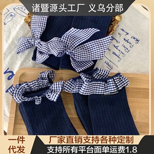 日系爆款蓬边饰品长筒藏蓝系中筒堆堆袜花边蝴蝶结甜美格子袜子女