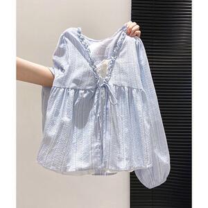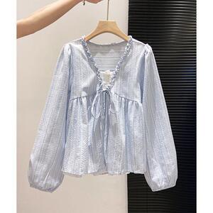 假两件早秋花边v领系带衬衫女2025新款韩版宽松休闲长袖娃娃上衣