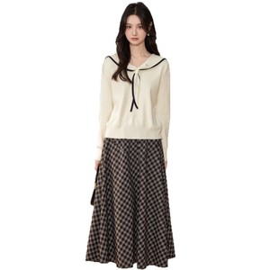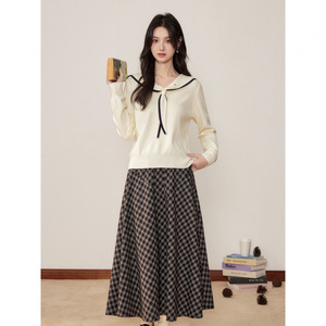 学院风海军领撞色拼接套头针织上衣格子半身裙两件套休闲百搭套装